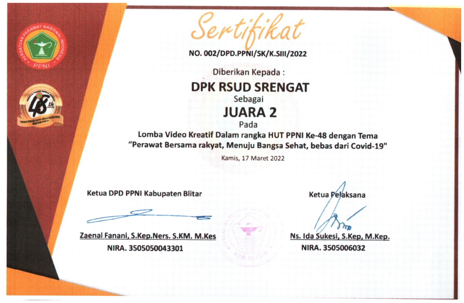 Juara II Lomba Video kreatif dalam rangka HUT PPNI ke-48