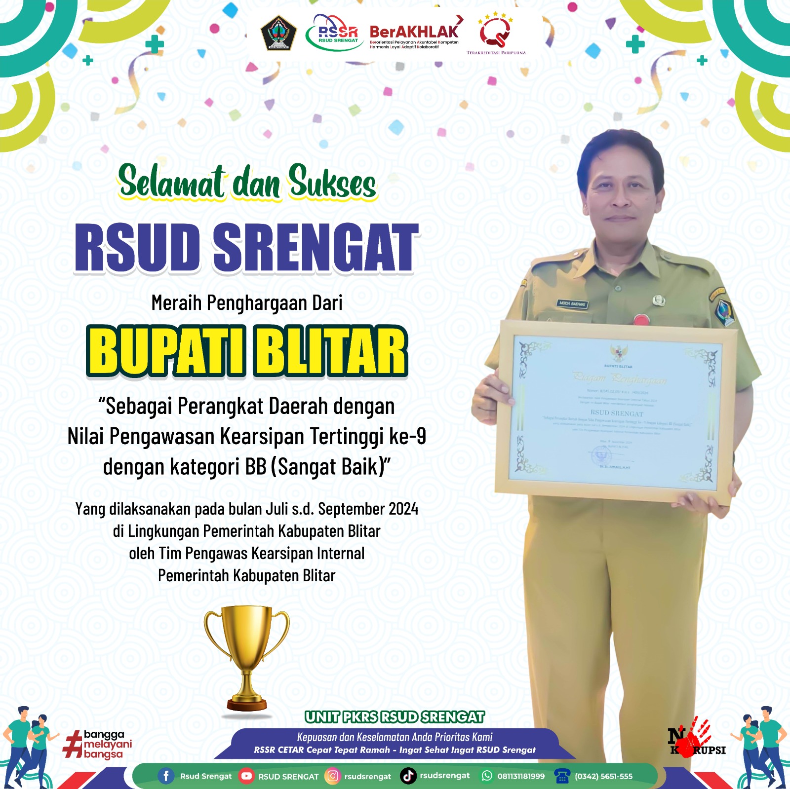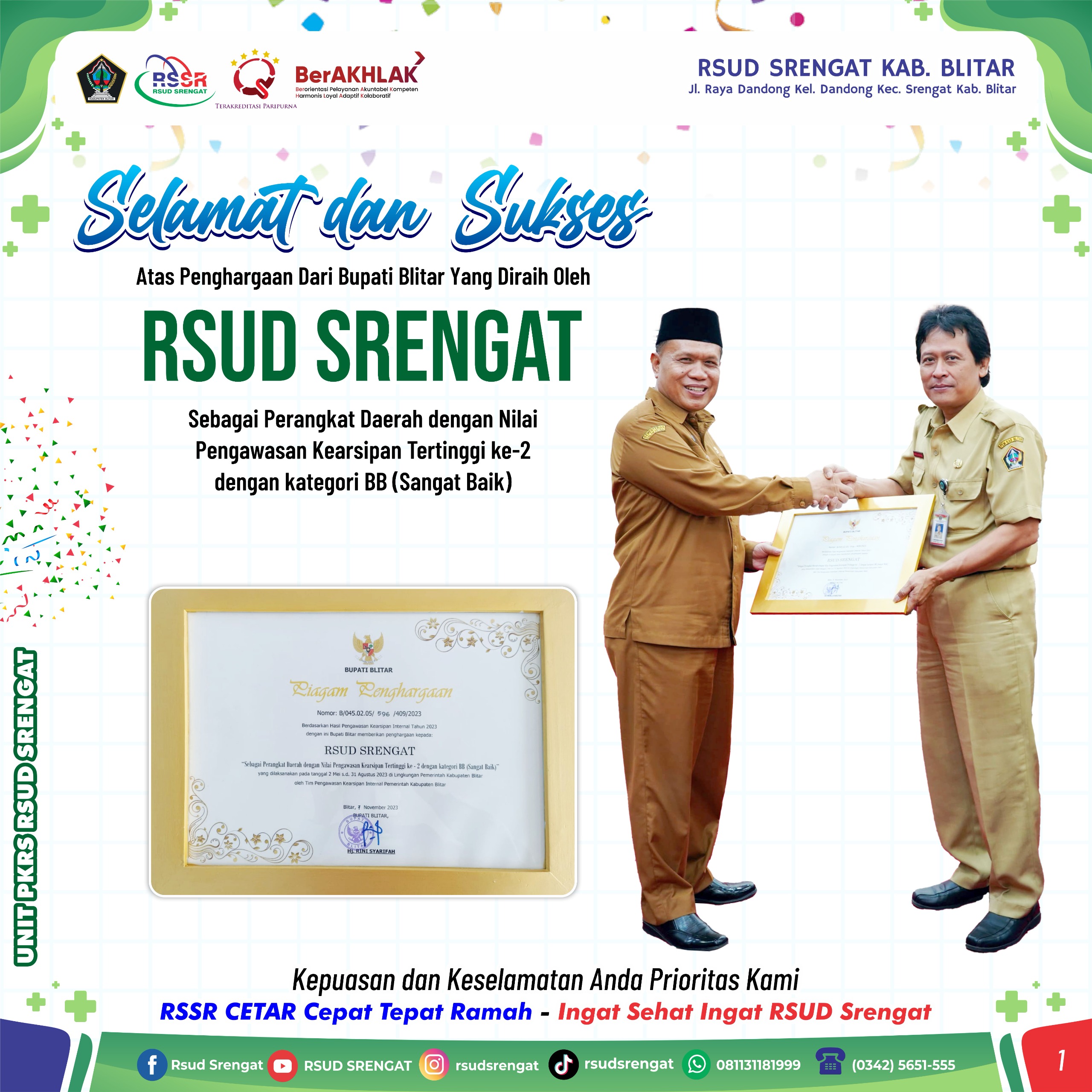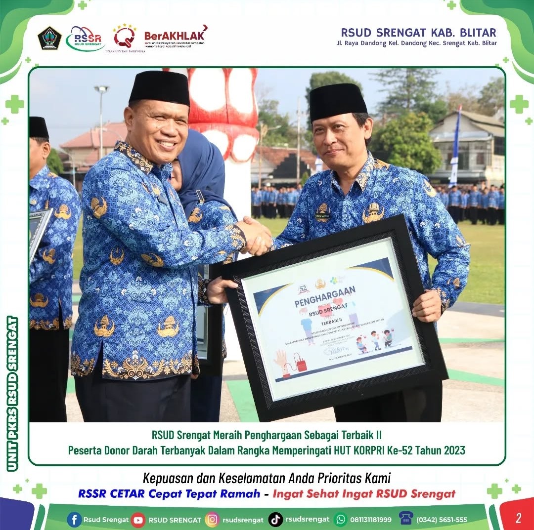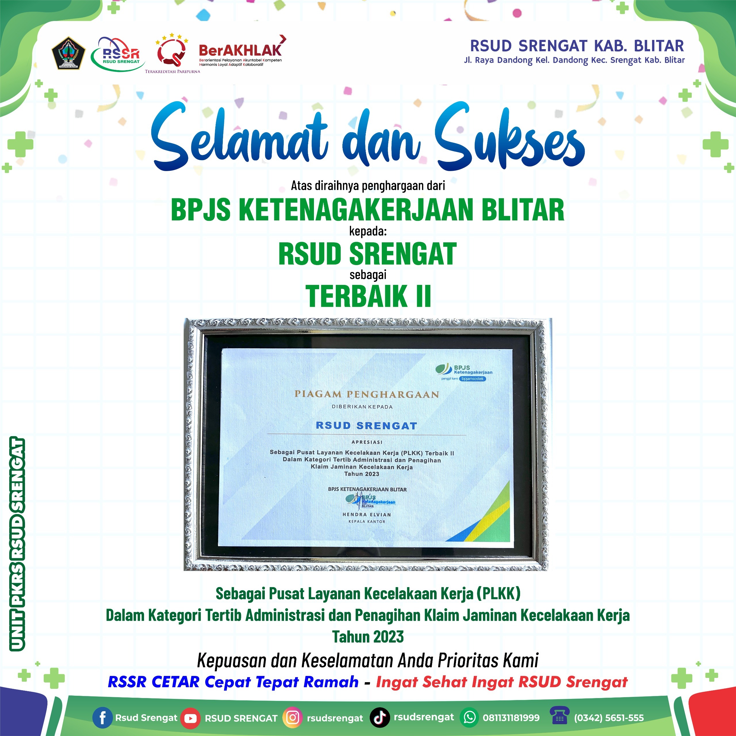 RSUD Srengat sebagai Pusat Layanan Kecelakaan Kerja (PLKK) Terbaik II dalam Kategori Tertib Administrasi dan Penagihan Klaim Jaminan Kecelakaan Kerja Tahun 2023 dari BPJS Ketenagakerjaan Blitar