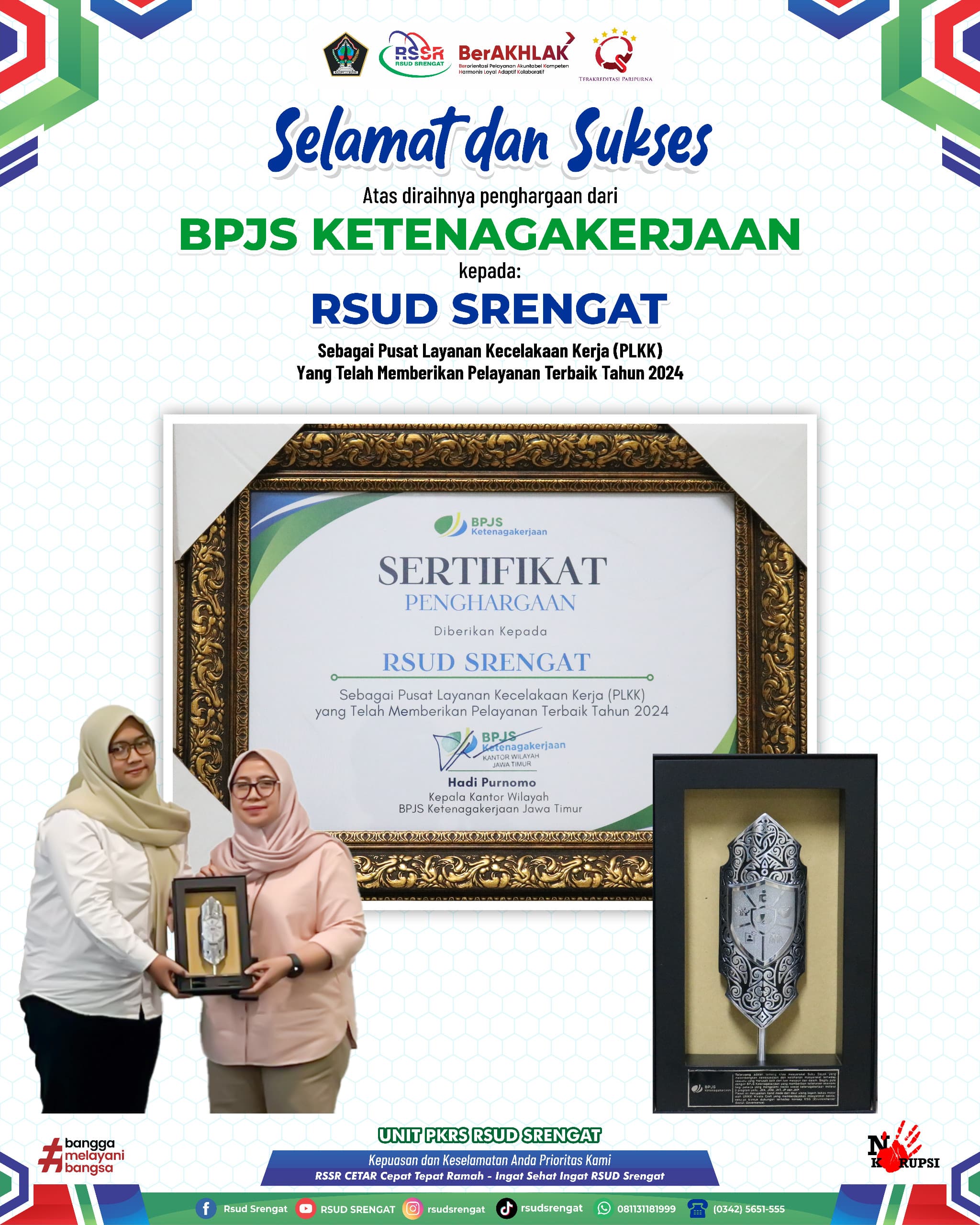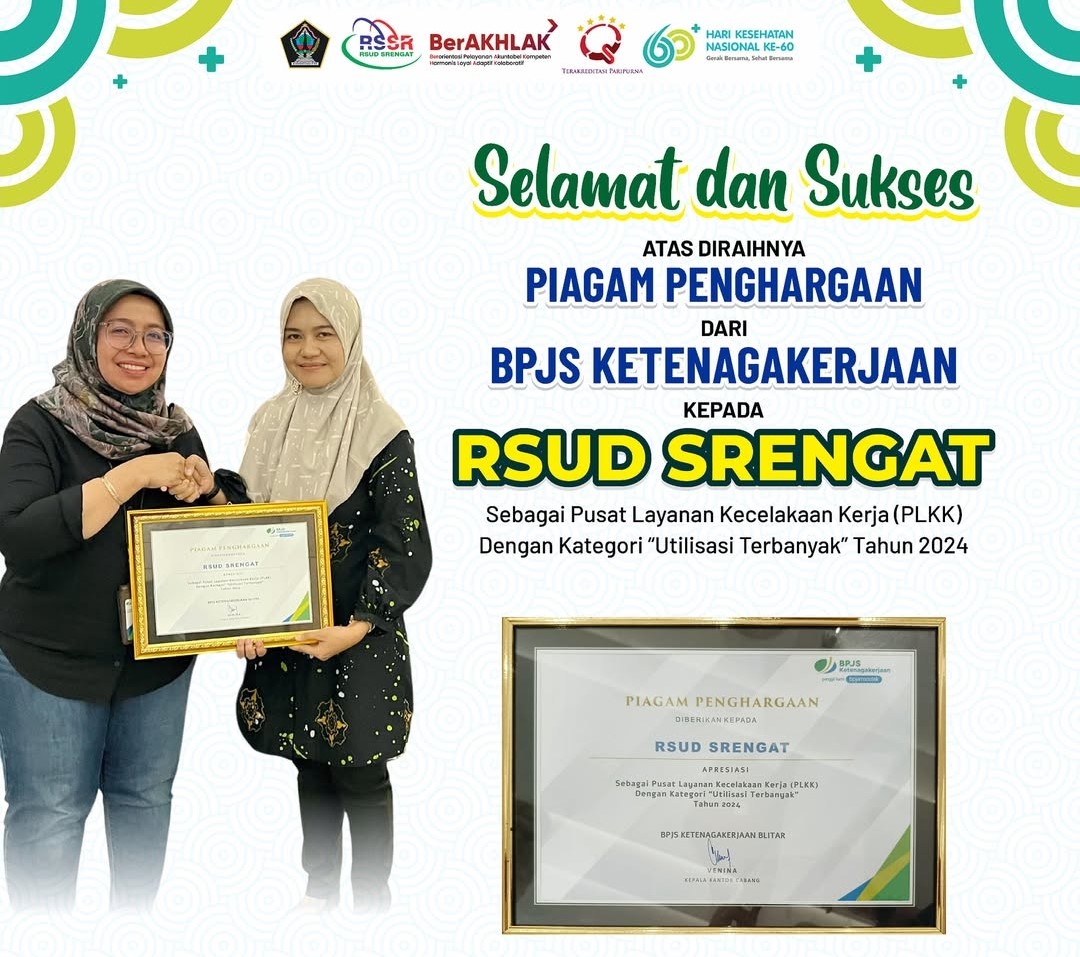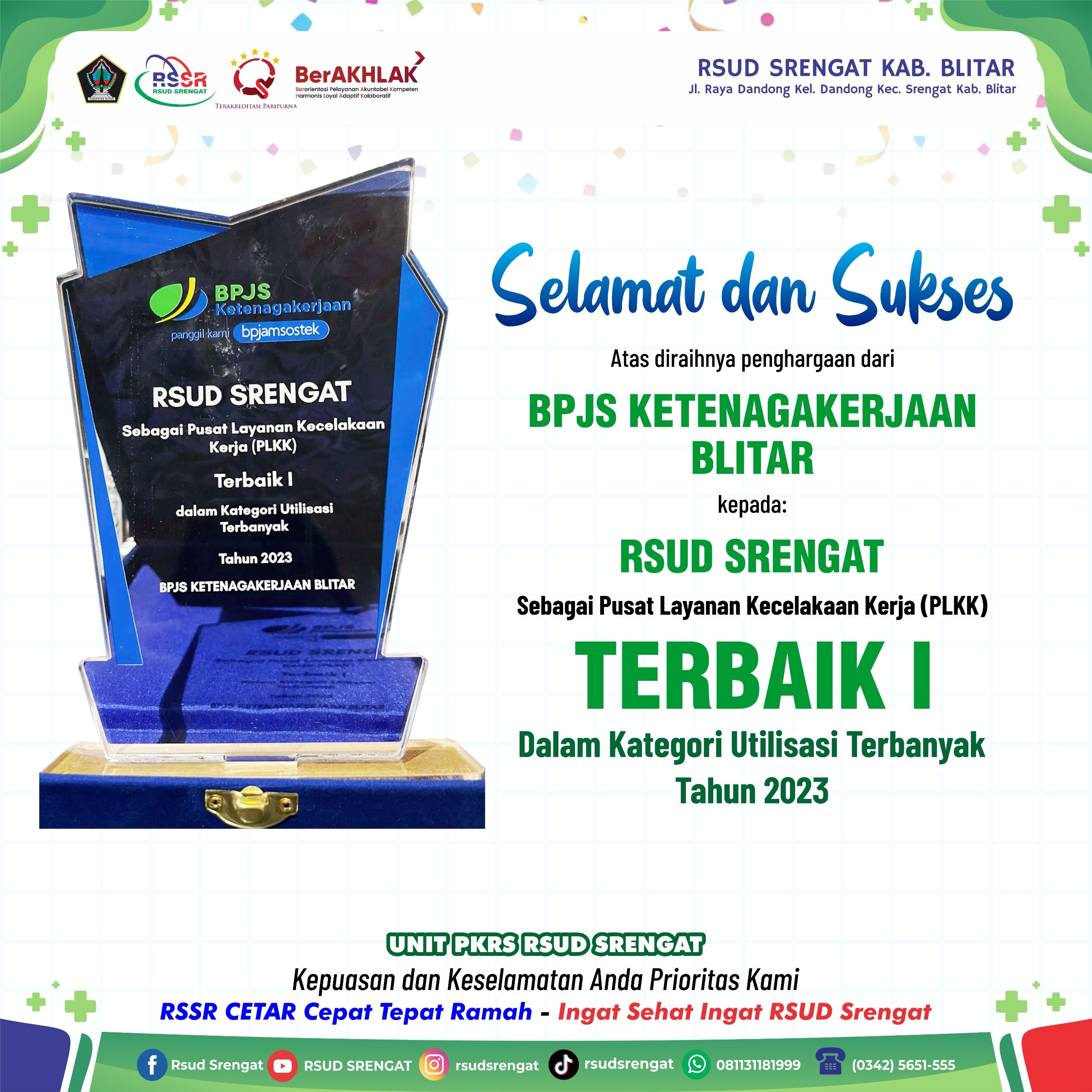 RSUD Srengat Sebagai Pusat Layanan Kecelakaan Kerja (PLKK) Terbaik I dalam kategori Utilisasi Terbanyak Tahun 2023 dari BPJS Ketenagakerjaan Blitar