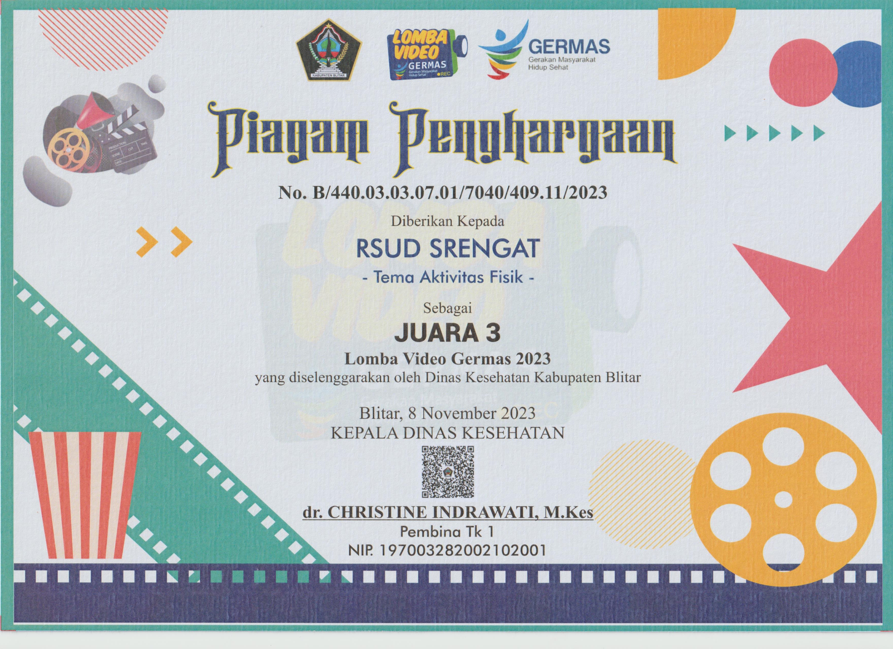 Juara 3 Lomba Video Germas 2023 oleh Dinas Kesehatan Kabupaten Blitar