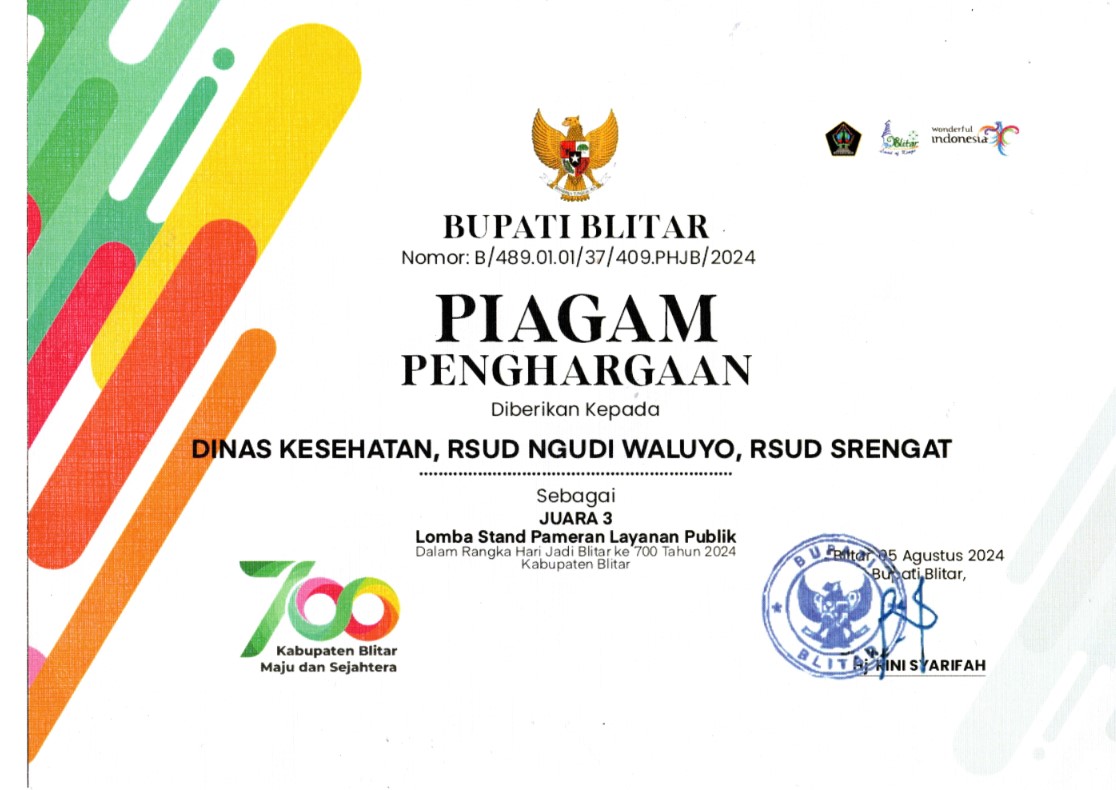 Juara III Lomba Stand Pameran Layanan Publik Dalam Rangka Hari Jadi Blitar Ke 700 Tahun 2024 (Dinas Kesehatan, RSUD Ngudi Waluyo Wlingi, RSUD Srengat)